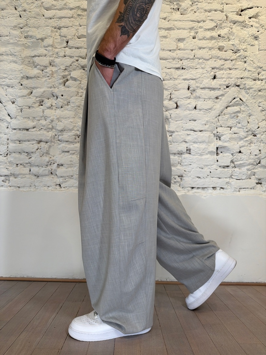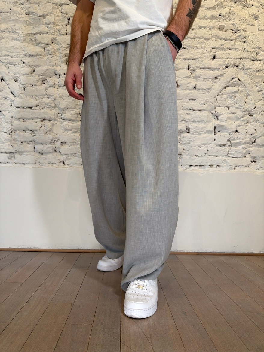 pantalone con pinces profonde sul fronte ed elastico in vita, gamba ampia